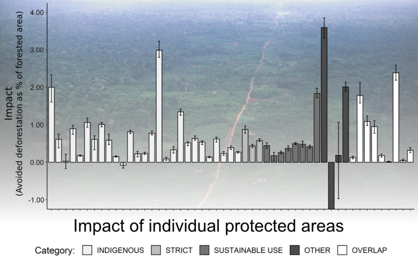 image: Individual protected areas showed substantial variation in their impact, i.e. estimated amount of prevented deforestation. The average impact over all areas, and also within each protection category, was positive.