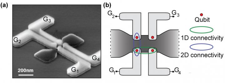 image: (a) Scanning electron image of one of the Foundry-fabricated quantum dot devices. Four quantum dots can be formed in the silicon (dark grey), using four independent control wires (light grey). These wires are the control knobs that enable the so called quantum gates. (b) Schematic of the two-dimensional array device. Each Qubit (red circle) can interact with its nearest neighbor in the two-dimensional network, and circumvent a Qubit that fails for one reason or other. This setup is what "second dimension" means.