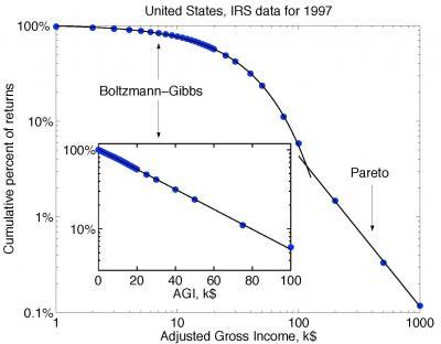 That the rich really are different is a common opinion. It turns out that the rich even have their own physics. Yakovenko, who is a professor at the University of Maryland and also a fellow of the Joint Quantum Institute*, produces a plot of the cumulative percentage of the population versus income. The graph shows that the actual income distribution (the data coming from the IRS) for the poorer 97% of reported returns follows a type of curve---the Boltzmann-Gibbs curve---that applies to the energy distribution of molecules in a gas. The curve is named for 19th century physicists Ludwig Boltzmann and J. Williard Gibbs, pioneers in statistical physics.