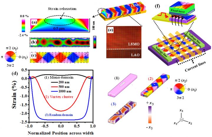 image: (a) simulated color scale map showing the relaxation of the growth strain in 0.5 μm wide La0.67Sr0.33MnO3 (LSMO) wire, lithographically fabricated from LSMO thin film grown on LaAlO3 (LAO) substrate. (b) Magnetic vortex cluster state observed in LSMO wire using variable temperature magnetic force microscopy (VT-MFM). (c) Phase field simulated image of domains in 0.5 μm wide LSMO wire. (d) Calculated strain profile as a function of normalized position across different widths of LSMO wires (left panel) and corresponding simulated magnetic domains in these wires (right panel). (e) High-angle annular dark-field (HAADF) scanning tunneling electron microscopy (STEM) image of LSMO/LAO. (f) Schematics for possible use of observed vortex cluster state for storage devices.