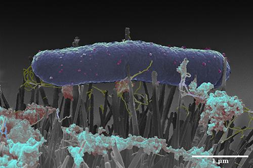 image: This is an E. coli bacteria lying on a bed of nano-nails.