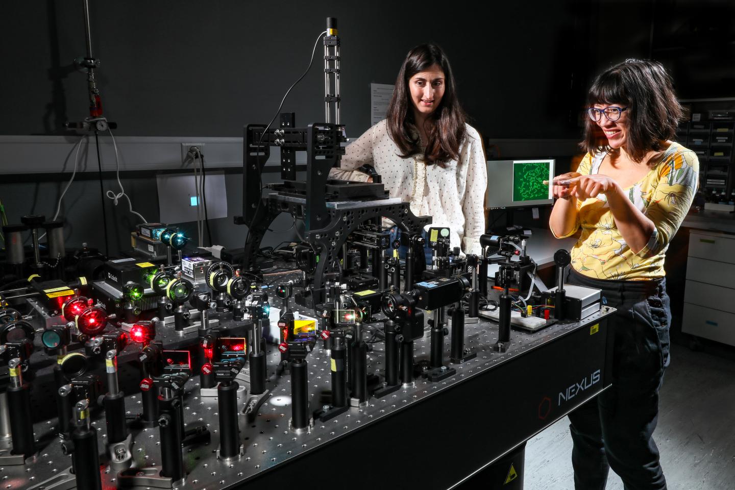 image: EPFL professor and biophysicist Suliana Manley with student Sofia Zaganelli and a super-resolution microscope.