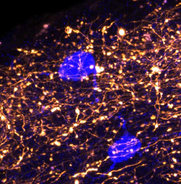 image: In the top-most layer of the neocortex, memory-related information is relayed by synapses from the thalamus (orange), which are in turn controlled by local 'gatekeeper' neurons (blue).