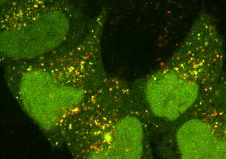 image: Pictured is the autophagy system in cells. Green and yellow dots: autophagosomes; red dots: autophagosomes fused with lysosomes.