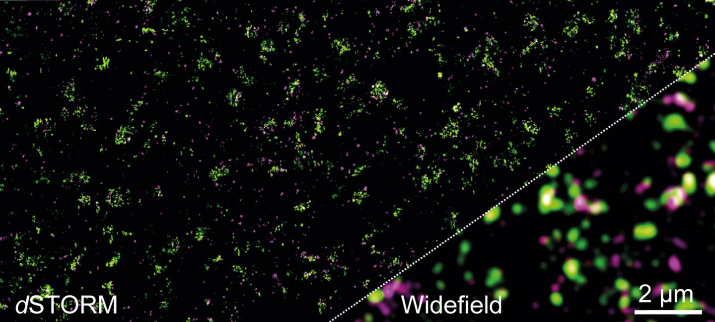 image: The distribution of the glutamate receptor mGluR4 and other proteins in the presynaptic membrane. Left a super-resolution dSTORM image. On the right, the result obtained with conventional fluorescence microscopy - molecular details are not visible here.