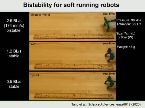 The fastest soft robots until now could move at speeds of up to 0.8 body lengths per second on flat, solid surfaces. The new class of soft robots, which are called "Leveraging Elastic instabilities for Amplified Performance" (LEAP), are able to reach speeds of up to 2.7 body lengths per second - more than three times faster - at a low actuation frequency of about 3Hz. These new robots are also capable of running up steep inclines, which can be challenging or impossible for soft robots that exert less force against the ground.
