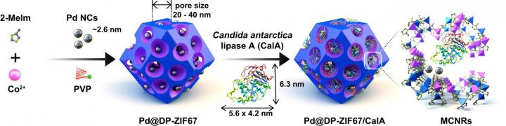 The research team synthesized a mesoporous metal-organic framework (MOF) with nano size pores (20~40nm) through the self-assembly of metal ions and organic ligands. Then, they created multimodal catalytic nanoreactors (MCNRs) by introducing metal nanoparticle catalysts and enzymes to the mesopores in phases. They verified that metal ions, nanoparticles, and enzymes allocated in the mesopores near MCNRs do not impede catalytic functionalities of each other but perform multistep cascade chemical reactions efficiently.