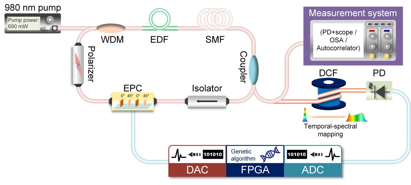 In a new paper published in Light: Science & Application, scientists from the State Key Lab of Advanced Communication Systems and Networks, Shanghai Institute for Advanced Communication and Data Science, Shanghai Jiao Tong University, Shanghai, China, for the first time, proposed using time stretch dispersive Fourier transformation (TS-DFT)-based fast spectral analysis as the discrimination criterion to achieve rich mode-locking regimes. By simply inserting a dispersion medium into the real-time feedback loop of an automatic mode-locking laser and combining this method with an intelligent polarization search using a genetic algorithm (GA), they can manipulate the spectral width and shape of the mode-locked femtosecond pulses in real time. The technique is termed as the time-stretch-assisted real-time pulse controller (TSRPC). With the TSRPC, the spectral width of the mode-locked femtosecond pulses can be tuned from 10 nm to 40 nm with a resolution of ~1.47 nm, and the spectral shape can be programmed to be hyperbolic secant or triangular. Benefitting from the TS-DFT and the real-time GA optimizer, the TSRPC overcomes the considerable slowness, cost, and bulkiness of traditional OSAs used in previous automatic mode-locking lasers. The TSRPC can be made even more portable by replacing the DCF with a small optical grating, and its spectral programming resolution can be improved by using an ADC with a higher sampling rate or a medium with large dispersion. Furthermore, with real-time control of the spectral width and shape of the mode-locking pulses, they revealed the complex and repeatable transition dynamics from the narrow-spectrum mode-locking regime to the wide-spectrum mode-locking regime, including five middle phases: a relaxation oscillation, single soliton state, multi-soliton state, triangle-spectrum transition, and chaotic transition, providing deep insight into the ultrashort pulse formation that cannot be observed with traditional mode-locked lasers.