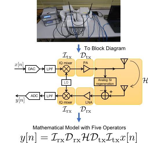 image: In-band full-duplex transceiver (top), circuit block model of transceiver (middle), mathematical model using five operators (bottom).