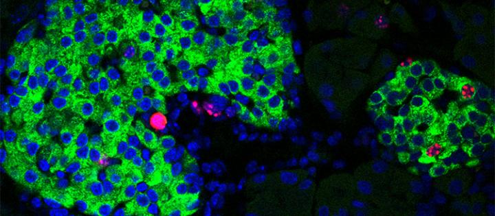 image: Image of pancreatic islets showing proliferation markers (in red staining) in the nuclei (in blue) of insulin-producing-cells (in green).