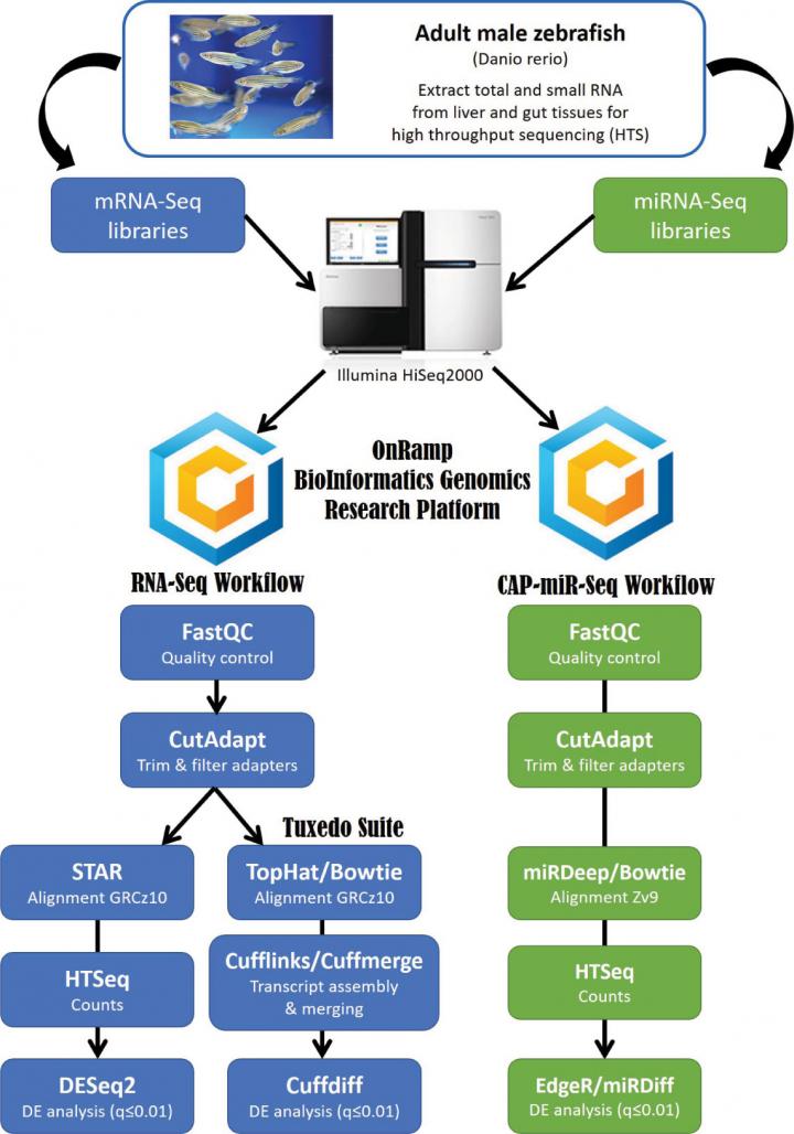 The objective of the research is to understand damages resulted by toxins to the liver and the intestine as well as its relation to MiRNome. Baseline Characterization in healthy animal tissue undergoing cellular homeostasis is required for initiating transcriptome process. For the experiment, researchers dissected wildtype fish (Zebrafish) and isolated their liver and gut; from these organs, small RNA was extracted. These organs were chosen because the liver is the main site for detoxification and gut is the primary site for contaminant exposure. From the RNA samples, mRNA and miRNA libraries were constructed and put under high throughout sequencing. Following sequencing, differential analysis was performed comparing liver mRNA contents with those in the gut. An "miRNA matrix" containing miRNA sequence and mRNA sequence was then constructed.
