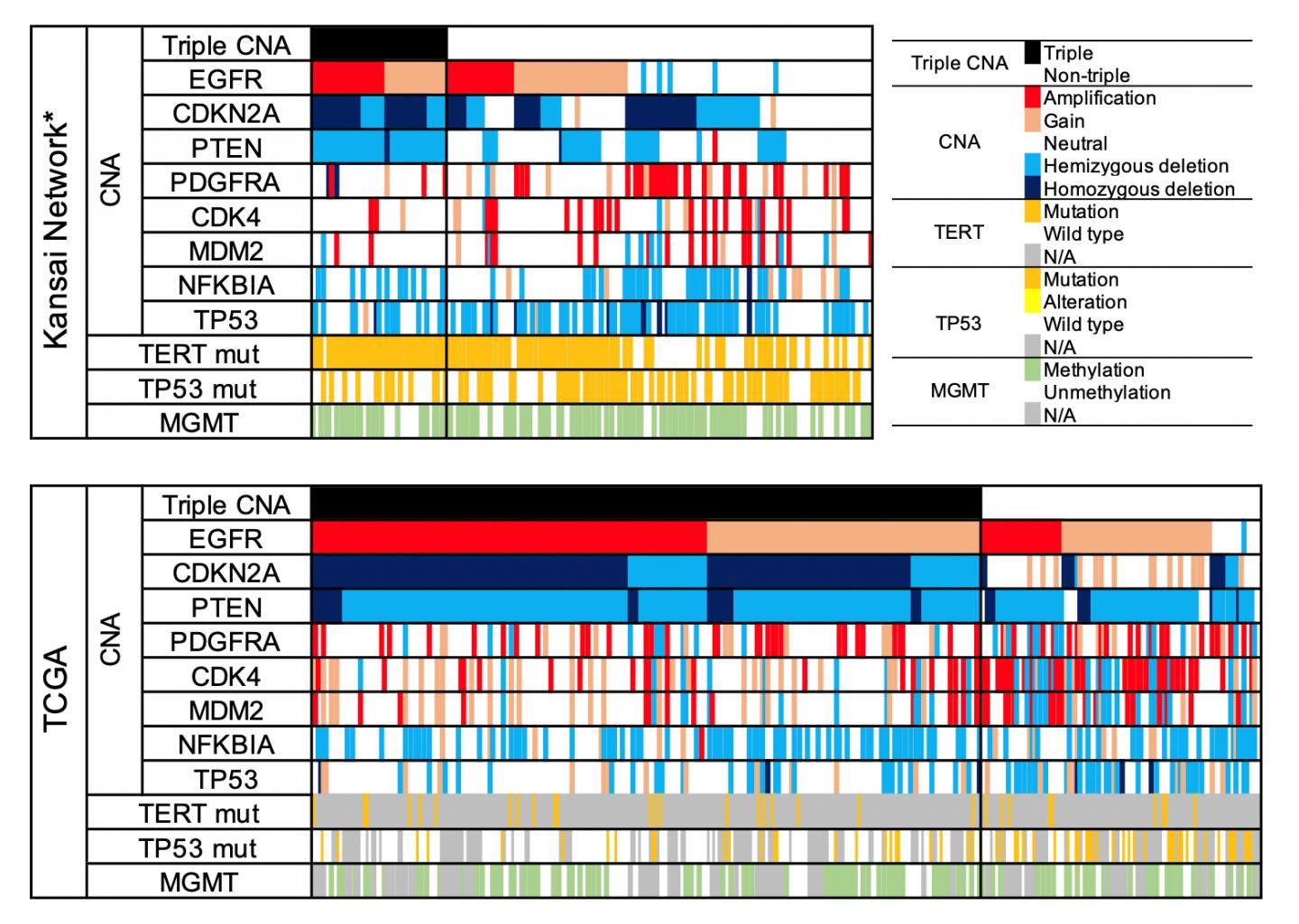 As a result, there were molecular disproportions between these two cohorts, that is, there was unequal distribution of specific copy number alterations (CNAs), such as EGFR gain, CDKN2A deletion, and PTEN deletion. They found that the triple overlap CNAs in these loci (triple CNA) were much higher in frequency in TCGA (70.5%) than KNBTG (24.3%). In addition, triple CNA proved to be a common poor prognostic factor between KNBTG and TCGA. In patients who received standard treatment, median overall survival was 19.3 months for the KNBTG cohort and 15.6 months for the TCGA cohort, and this survival difference was highly associated with differences in the triple CNA frequency.