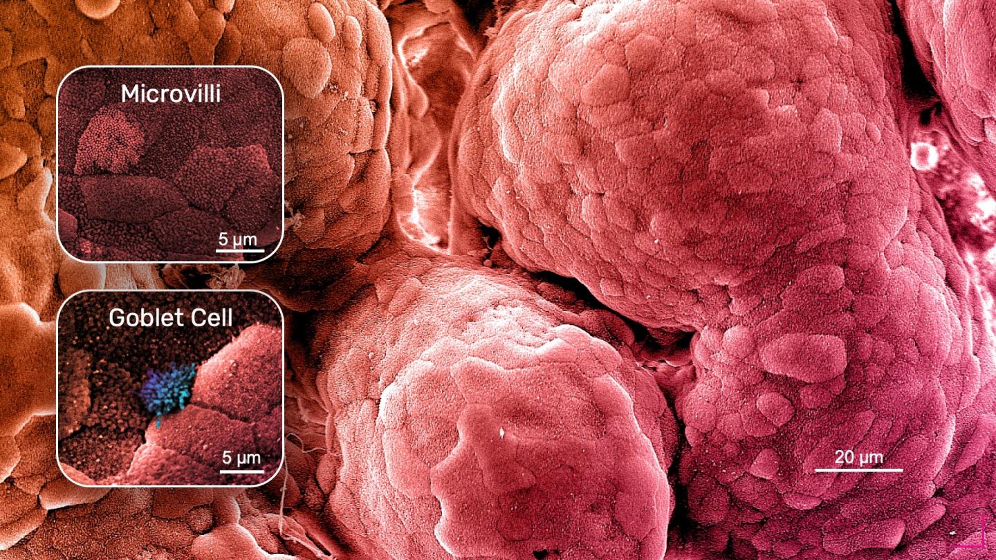 image: SEM image of the Intestine-Chip showing the presence of a well-developed continuous brush border consisting of densely packed microvilli, as well as mature specialized cell types such as mucus producing goblet cells.
