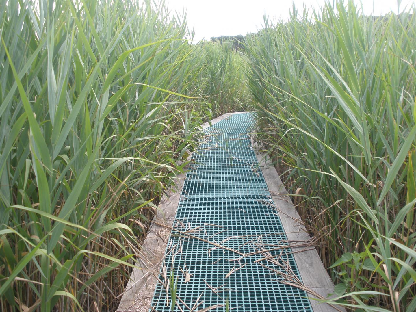 image: Invasive Phragmites reeds encroach on a boardwalk in a Maryland marsh. On this marsh, biologists with the Smithsonian Environmental Research Center have been running climate change experiments for more than 30 years.