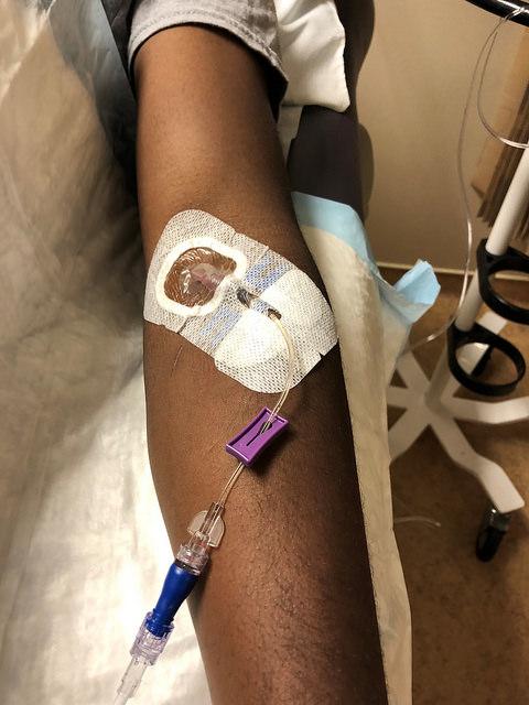 image: May 21, 2018 - A healthy volunteer receives an intravenous infusion of mAb114--an experimental treatment for Ebola virus disease--in a Phase 1 clinical trial held at the NIH Clinical Center in Bethesda, Md.