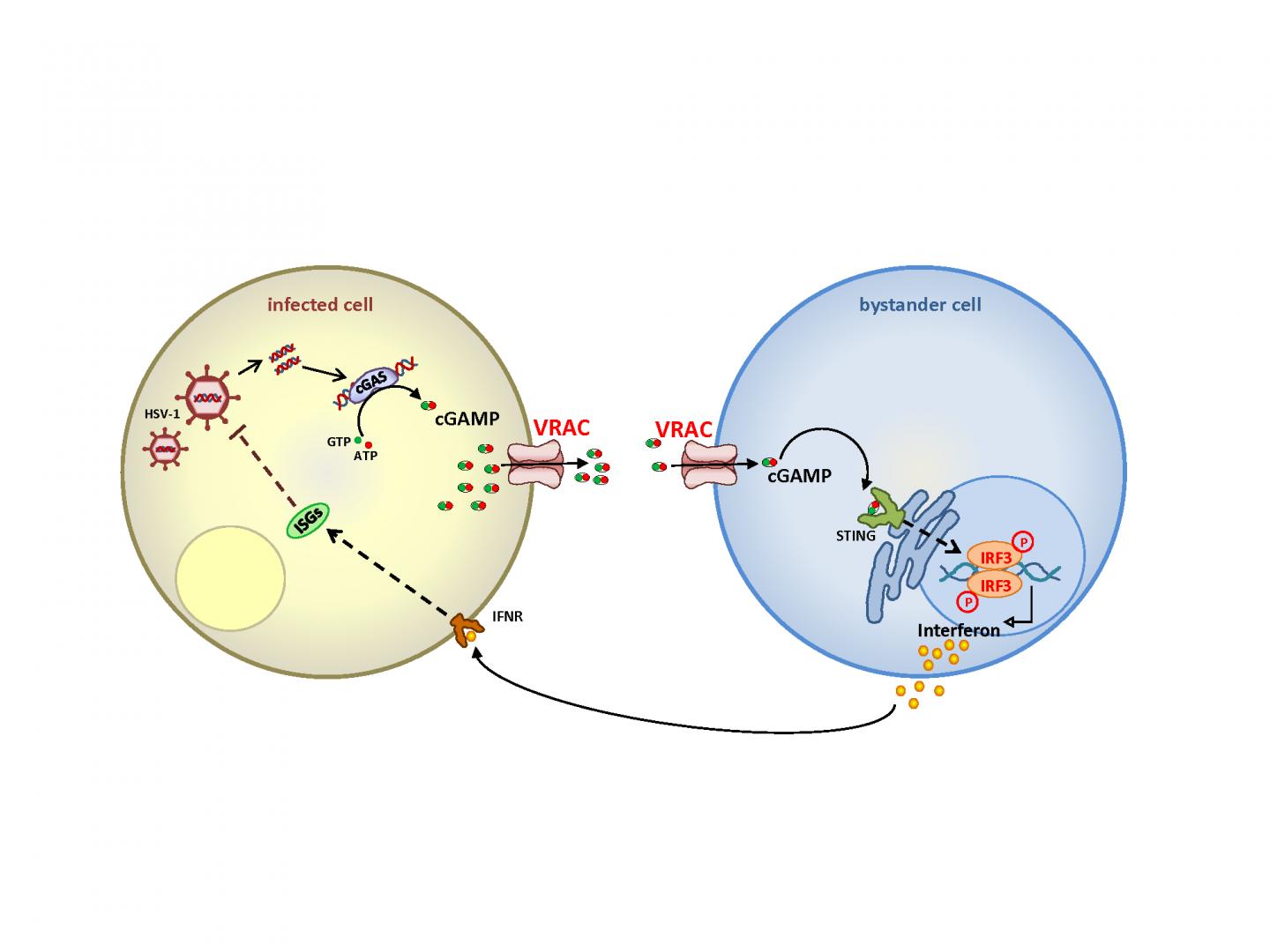 image: Upon infection of cells with a DNA virus (left), viral DNA binds to the enzyme cGAS which then synthesizes the messenger molecule cGAMP. The present work shows that cGAMP can leave the cell through the anion channel VRAC and diffuses to non-infected cells in the vicinity. After entering the cell - again through VRAC - it binds to a receptor called STING and stimulates indirectly the synthesis of interferon, which leaves the cell and suppresses, after binding to a receptor, the propagation of the virus (left cell). This provides a powerful amplification of the innate immune response against DNA viruses.