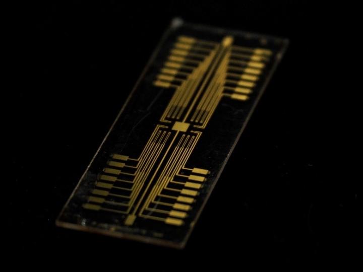 image: Photograph of a neuromorphic device used in this study.