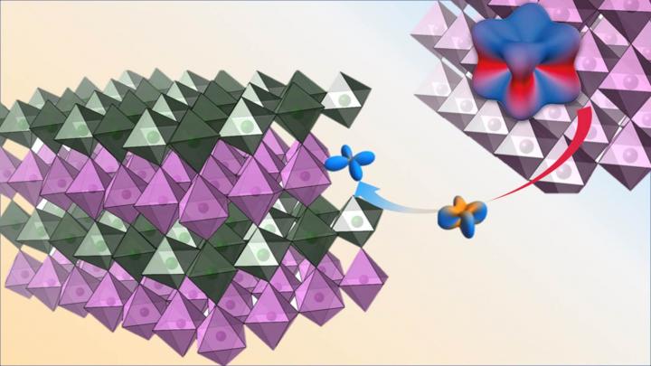 image: The right side of this image shows a cloud of electrons around an iridium ion. The left side shows an iridium ion interfacing with nickel, where the iridium's shape is strongly altered and its strong spin-orbital interaction effectively 'disappears.'