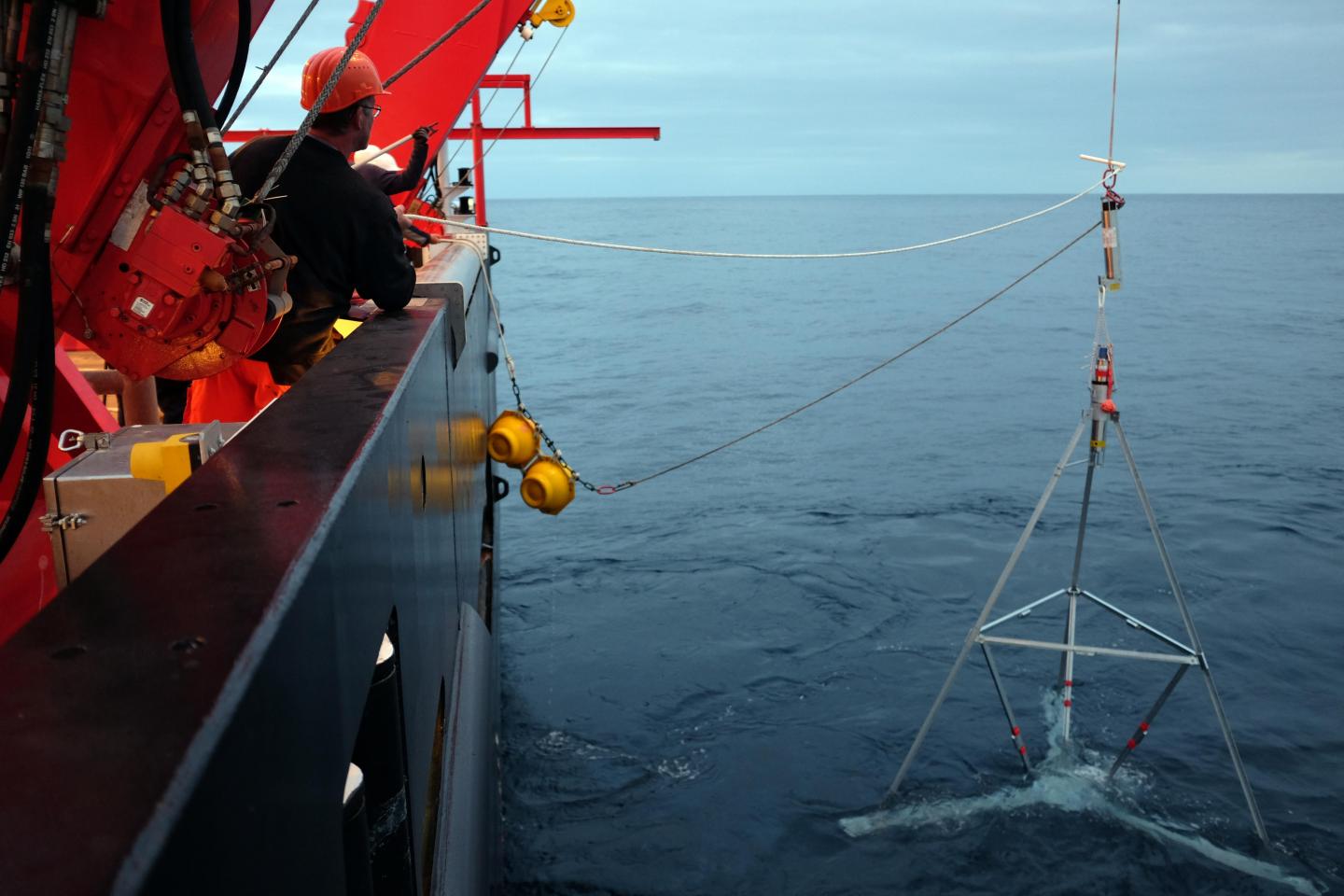 image: A GEOSEA-tripod is launched from a research vessel.