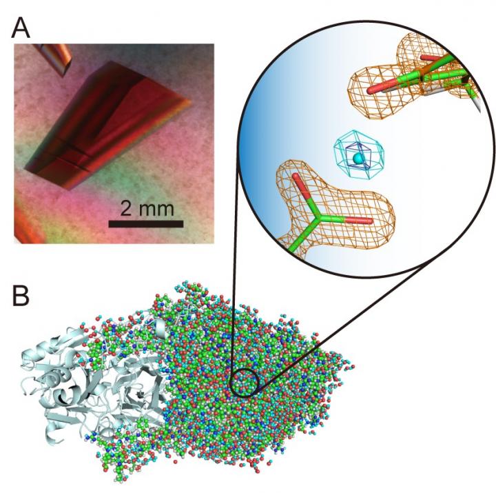 image: (A) Extra-large crystal of a copper amine oxidase. (B) Three-dimensional structure of the copper amine oxidase including hydrogen atoms. An unusual "levitated" proton is presented in the center of enlarged view.