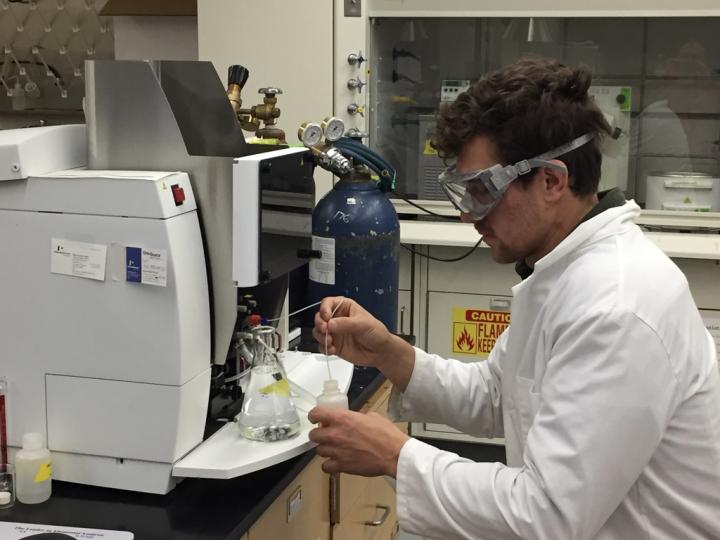 image: Researcher at Whitman College on Flame Atomic Absorption Spectrometer (FAAS).