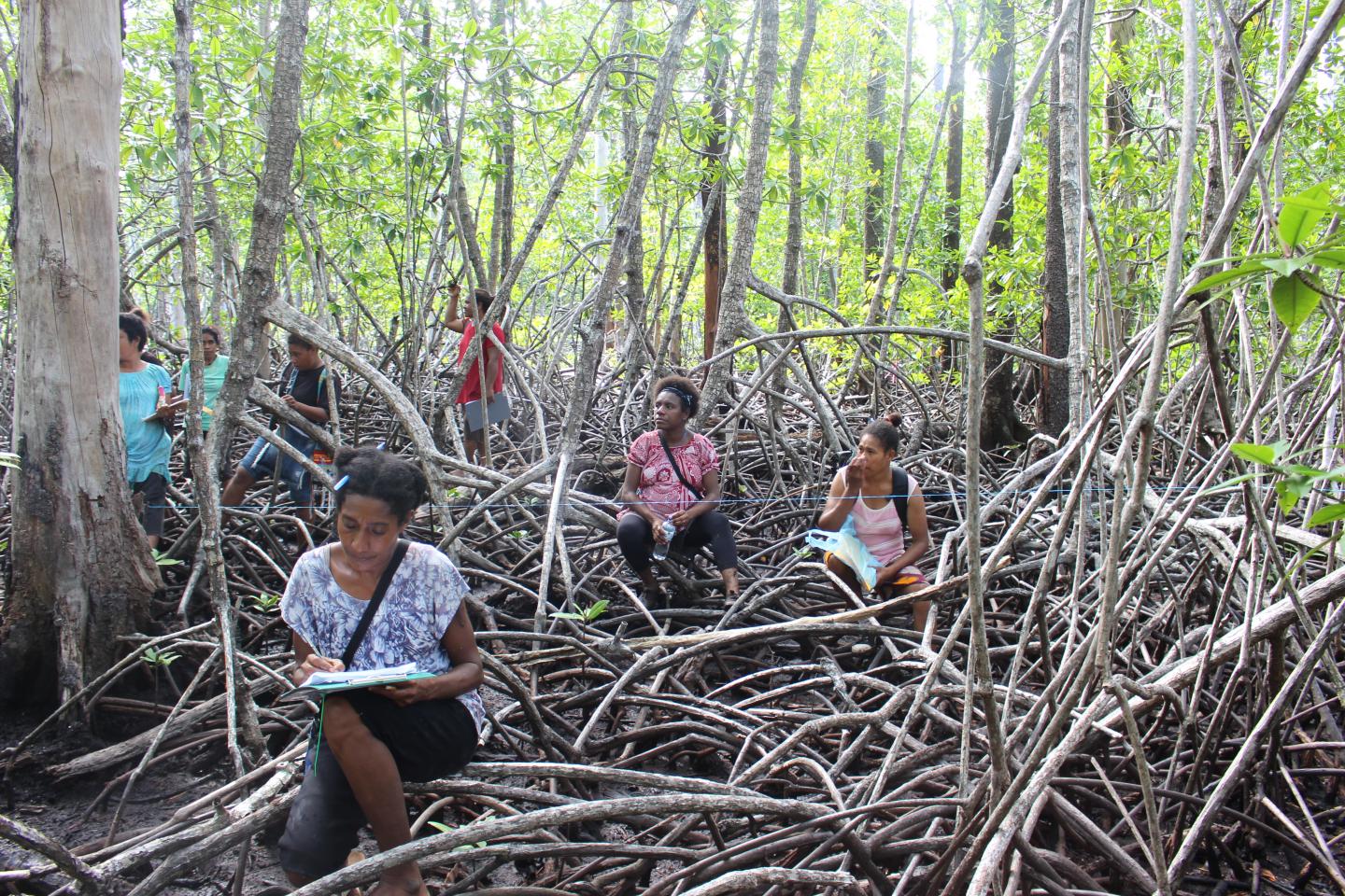 image: Women surveying mangrove forests as part of Mangoro Market Meri in Papua New Guinea.