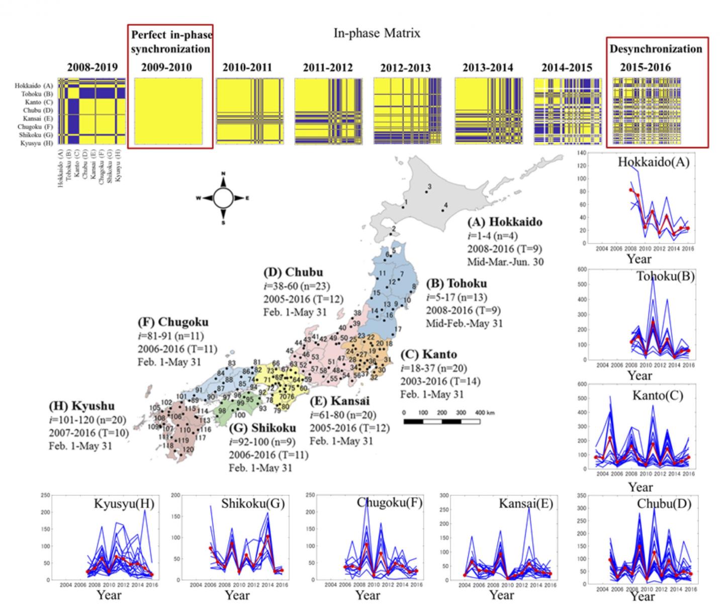 This research is the first of its kind to study this synchronicity at the national scale and operates across a wide range of academic fields such as nonlinear physics, ecology, and environmental science. "We used a new 'in-phase and out-of-phase' approach as an update to the previous correlation-based methods," says co-author of the study Kenshi Sakai. "We found that the phase synchronizations within and between regions were strong in eastern regions of Japan, such as Hokkaido and Kanto, but the synchronization in western regions was much weaker."