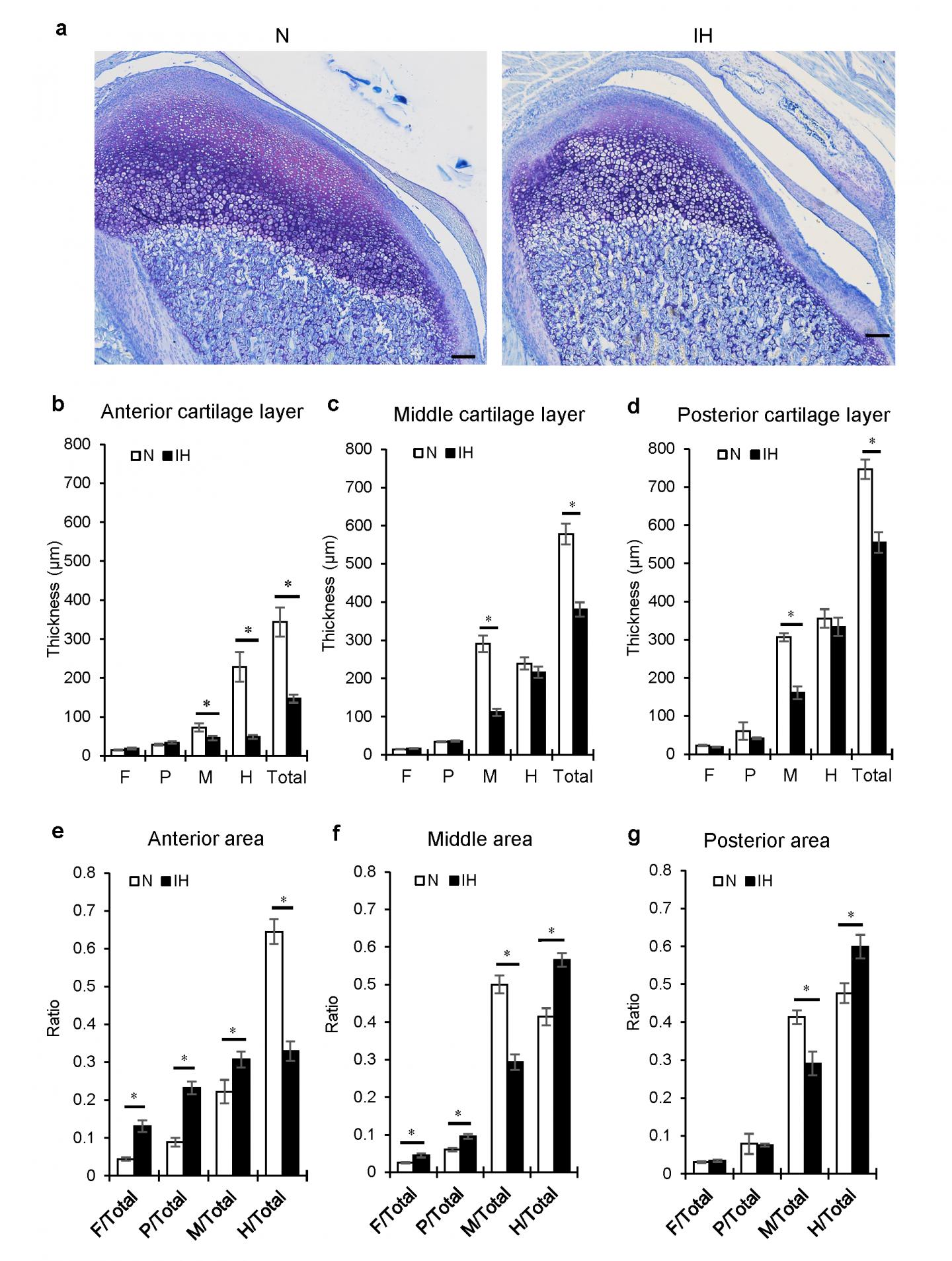 image: Histological changes in mandibular condylar cartilage of IH rats. (a) Representative images of toluidine blue-stained sagittal sections of mandibular condyle from the N and IH groups. Thickness of each cartilage layer of anterior (b), middle (c), and posterior (d) parts in mandibular condyle. Ratios of each cartilage layer to total cartilage thickness shown in panels (e-g). F fibrous layer, P proliferating layer, M maturative layer, H hypertrophic layer. Scale bar?=?100 μm. Data are mean?±?SEM for each group. *P?