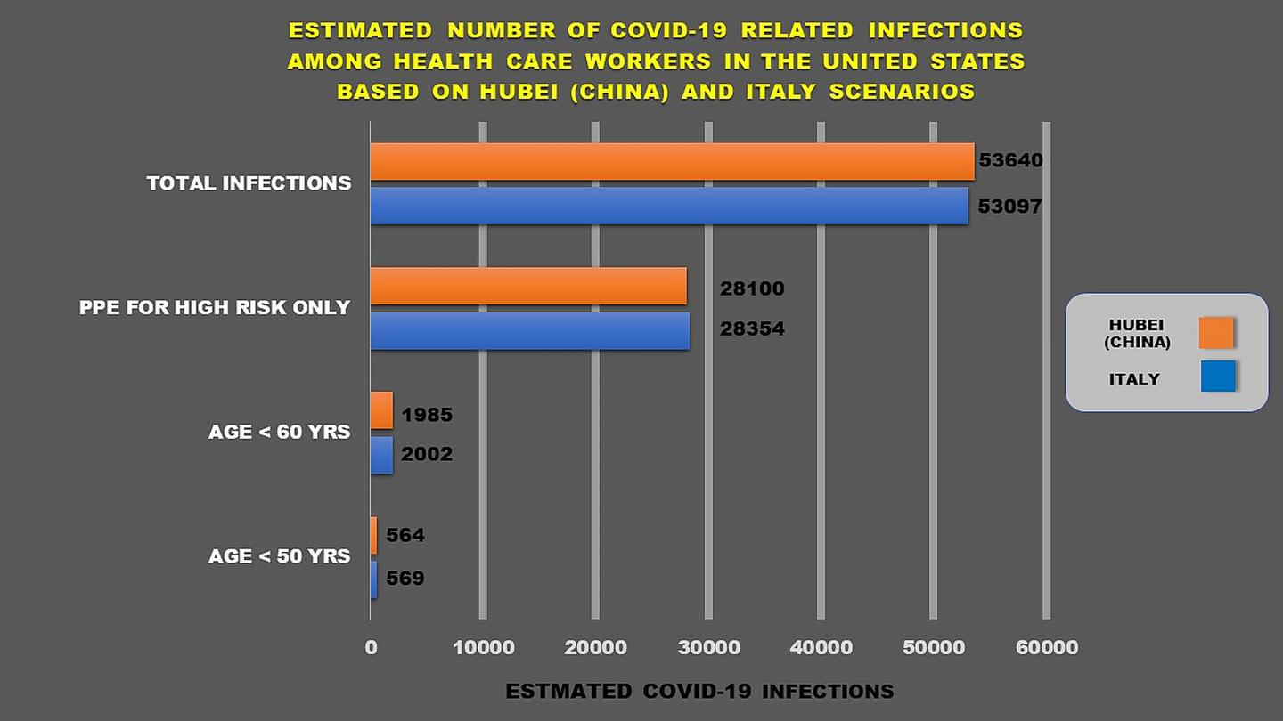 The estimates by the researchers also suggest that if health care workers considered high risk -- including those over age 60 -- wore appropriate personal protective equipment -- such as gowns and face masks -- the number of infections would decrease to about 28,000 and the number of deaths to between 700 and 1,000. If hospital workers age 60 and over are restricted from direct patient care, then the predicted numbers could drop to 2,000 infected and 60 deaths.