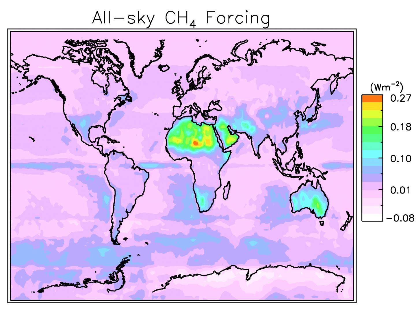Their analysis showed that methane forcing is not spatially uniform whatsoever, and exhibits remarkable regional patterns. The most striking finding from the first comprehensive calculations of methane forcing is that because desert regions at low latitudes feature bright, exposed surfaces that reflect light upwards to enhance the absorptive properties of methane, there can be a 10-fold increase in the localized methane shortwave forcing.