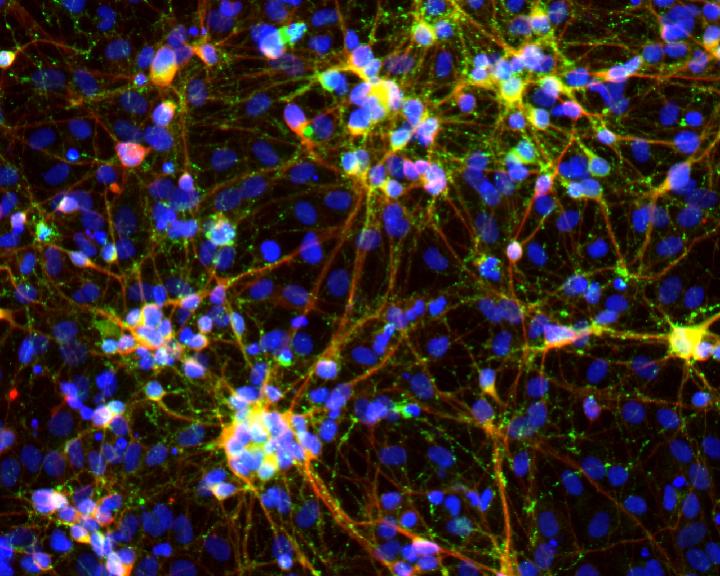 image: Human induced neurons generated from a novel transcription factor pair Neurog3/Pit1. Colors represent a nuclear stain (DAPI) in blue, synaptic marker expression (Synapsin1) in green, and neuron-specific beta-III tubulin expression (Tuj1) in red.