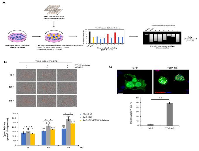 The research team found a new role of three proteins (PTK2, TBK1, SQSTM1) which can inhibit neuronal degeneration by TDP-43 and demonstrated for the first time that their interaction can alleviate neurodegeneration by strengthening "autophagy lysosome pathway (ALP),*" which consists of another protein quality control system in case of damage to the UPS.