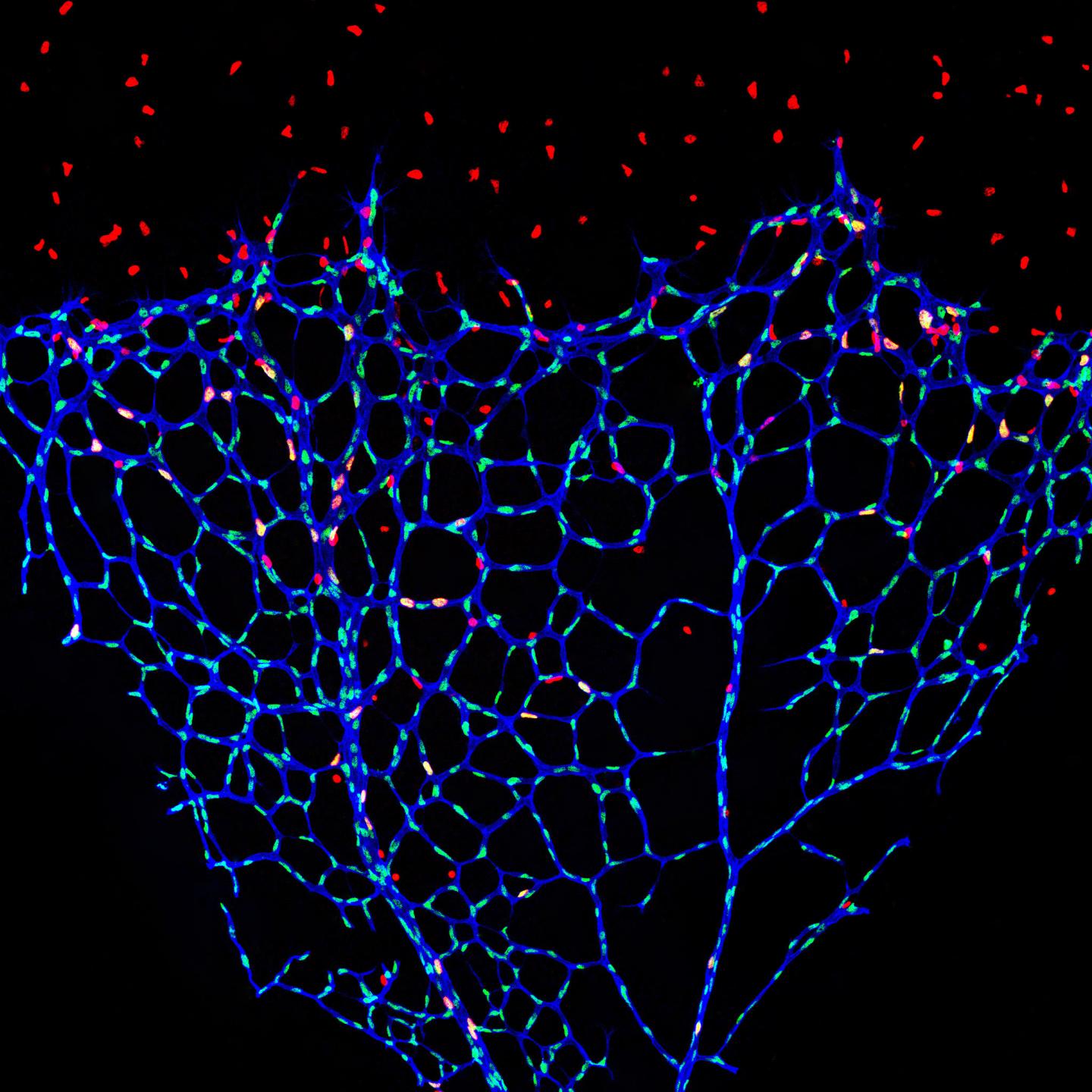 image: Retinal vessels of a mouse in which S-2-hydroxyglutarate levels are selectively increased in the endothelium. Blood vessels (blue), nuclei of dividing endothelial cells (yellow), resting endothelial cells (green), other cells dividing (red).
