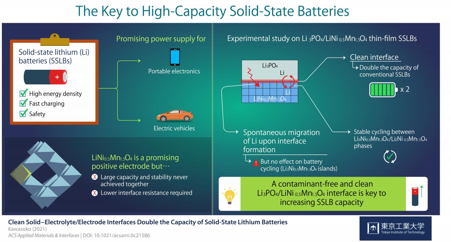 Scientists at Tokyo Institute of Technology (Tokyo Tech), Tohoku University, National Institute of Advanced Industrial Science and Technology, and Nippon Institute of Technology, demonstrated by experiment that a clean electrolyte/electrode interface is key to realizing high-capacity solid-state lithium batteries. Their findings could pave the way for improved battery designs with increased capacity, stability, and safety for both mobile devices and electric vehicles.