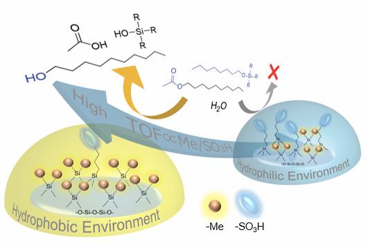 image: Simplified schematic showing how alkyl acetates with long tails cannot approach acidic sulfo sites (blue discs) in hydrophilic environments; however, they can approach hydrophobic environments with more methyl groups (small orange spheres), leading to a higher turnover frequency (TOF), a measure of how effective a catalyst is.
