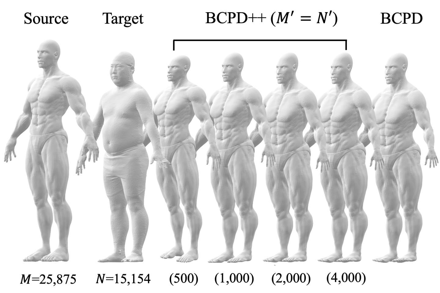 image: Application to human body data. The leftmost shape is deformed so that it overlaps the target shape. The rightmost shape is the result of applying the previous method reported by the author. The four shapes indicated by "BCPD++" are the results of the proposed method; the approximation for speeding up is improved from left to right. Despite the approximate computation, the third and fourth shapes among the four are roughly the same as that obtained by the previous method. Although not shown in the figure, the runtime is noticeably reduced compared to the previous method.