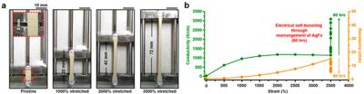 Contrary to typical materials, the electrical conductivity (and thus performance) of which decreases when the shape of the materials is changed by an applied tensile strain, the new material developed by the KIST research team shows a dramatic increase in conductivity under a tensile strain of 3,500 percent. In fact, electrical conductivity rose over 60-fold, achieving the highest conductivity level reported worldwide so far. Even if the material is damaged or completely cut through, it is able to self-heal, a property that is already gaining attention from academia.