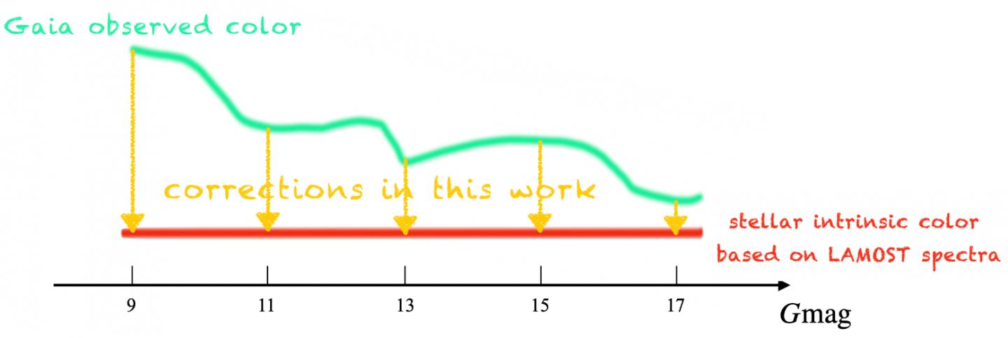"Applying the relationship to the whole sample, the differences between the observed colors and model-determining colors at different G magnitudes represent the color correction terms," said Prof. LIU Jifeng from NAOC.