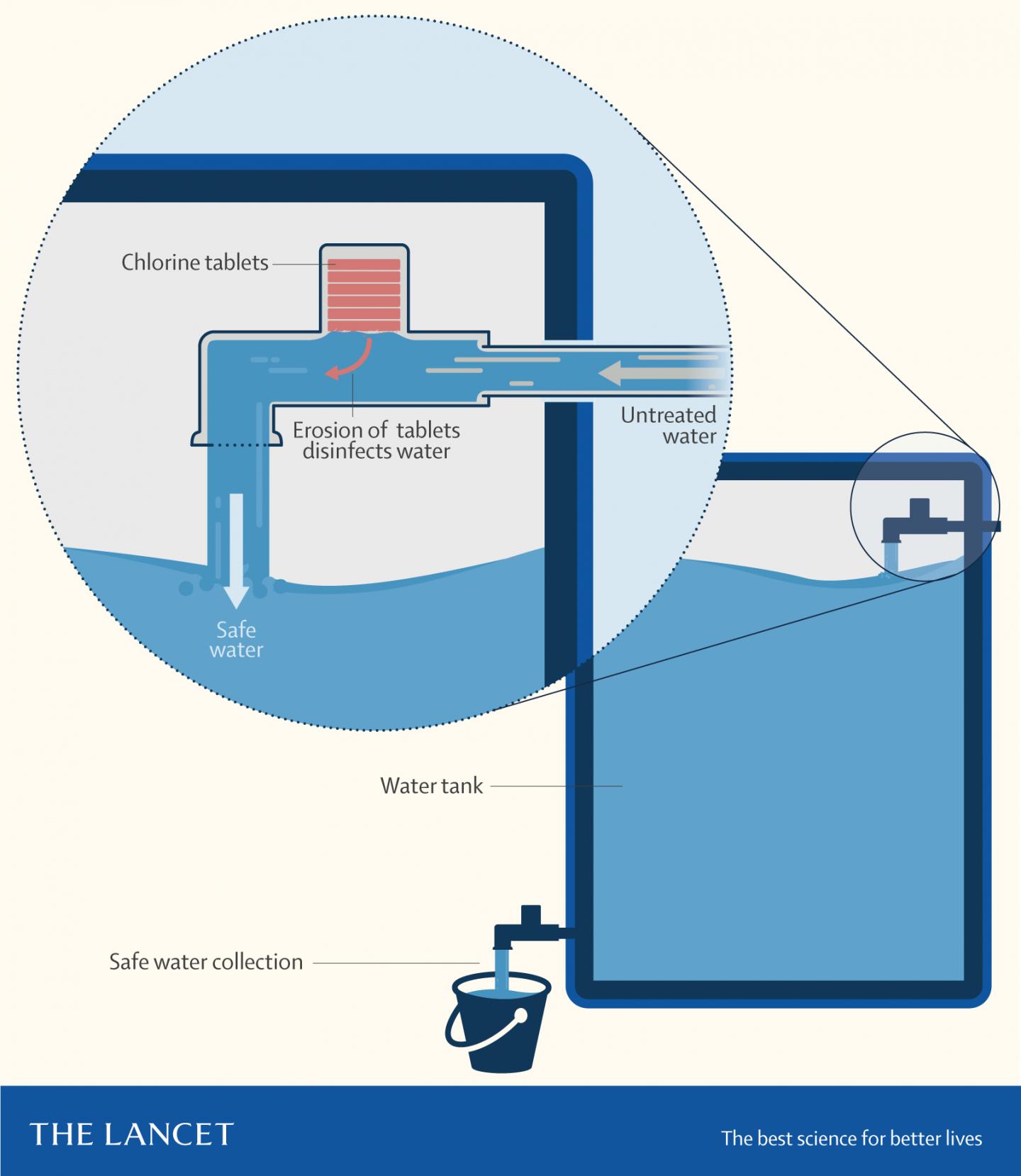 Most previous research has focused on household-level water treatment interventions that require people to calculate the correct dosage and add their own chlorine daily--but these have had low uptake and failed to reduce diarrhoea, partly because they deliver a chlorine dose that makes chlorinated water taste and smell unpleasant.
