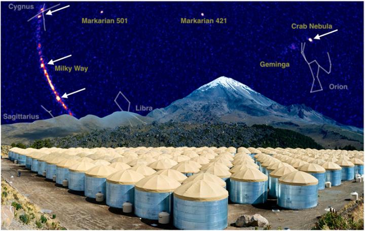 This compound graphic shows a view of the sky in ultra-high energy gamma rays. The arrows indicate the four sources of gamma rays with energies over 100 TeV from within our galaxy (courtesy of the HAWC collaboration) imposed over a photo of the HAWC Observatory's 300 large water tanks. The tanks contain sensitive light detectors that measure showers of particles produced by the gamma rays striking the atmosphere more than 10 miles overhead (courtesy of Jordan Goodman).