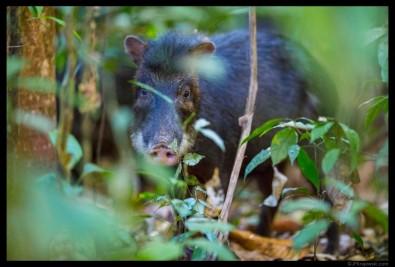 The White-lipped peccary Tayassu pecari is a boar-like hoofed mammal found throughout Central and South America. These animals roam the forest in bands of 50 to 100 individuals, eating a wide variety of foods. In Brazil's Atlantic Rainforest, they prefer the fruit of the jussara palm Euterpe edulis.