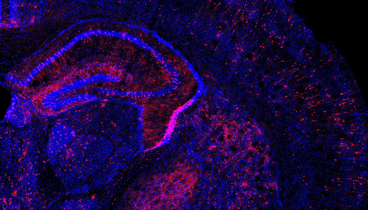 image: Scientists at Harvard University, the Broad Institute of MIT and Harvard, and MIT applied the Perturb-Seq method to the developing mouse brain by introducing multiple genetic changes to cells (in red) and measuring how gene expression changed in individual cells.