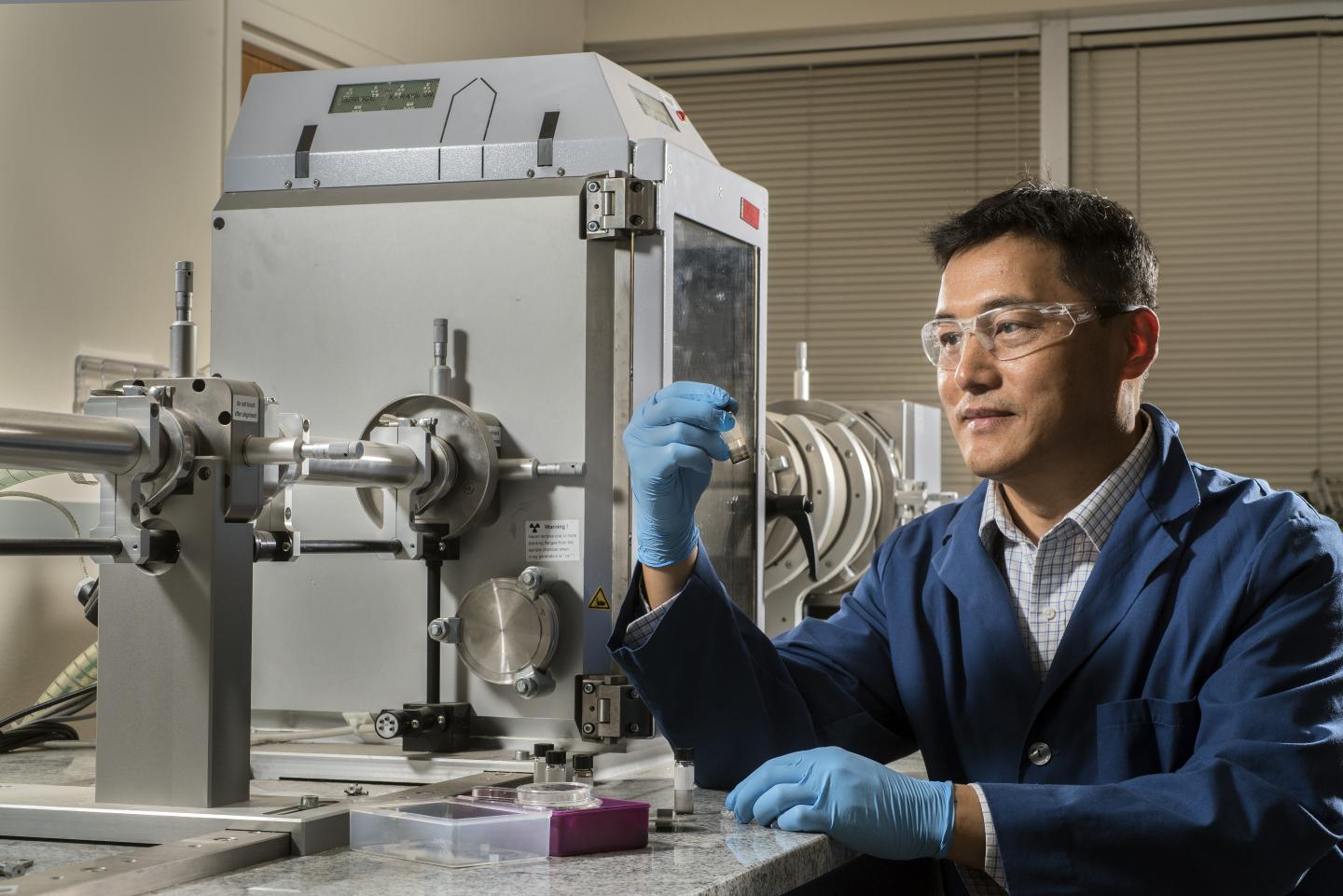 image: Sandia National Laboratories researcher Hongyou Fan holds a vial of gold supercrystals he will characterize in the X-ray scattering instrument to his right.