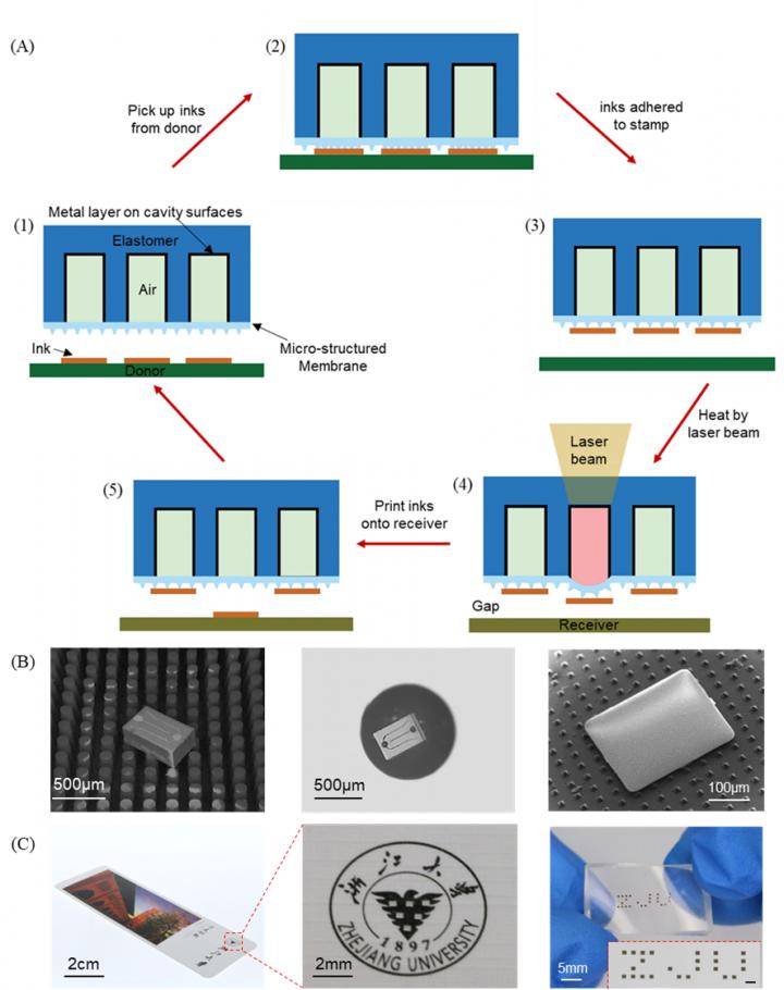 In response to this challenge, Song's group in Zhejiang University developed a laser-driven programmable non-contact transfer printing technique via a simple yet robust innovative design of an active elastomeric micro-structured stamp with tunable adhesion. The tunable adhesive features cavities filled with air and encapsulated by a micro-patterned surface membrane duplicated from low-cost and easily available sandpapers. The micro-patterned surface membrane can be inflated dynamically to control the interfacial adhesion by heating the air in cavities through a metal layer (e.g., iron particles) on the inner cavity surface, which serves as the laser absorbing layer. This construct offers continuously thermal-controlled tunable adhesion with a large switchability of more than three orders of magnitude at a temperature increase below 100 °C.