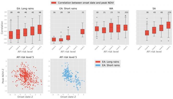 image: Top: Whisker plots describing the variability of correlation between timing of onset of the rainy season (onset date) and peak NDVI (indicator of drought) in the following months for East, West, and Southern Africa based on Acute Food Insecurity (AFI) risks (Table 1). Bottom: Scatter plots of standardized anomaly of onset date timing and peak NDVI for the AU2s with the highest AFI risks. *The number on the top of box-whisker plots indicate the number of AU2 in each of the corresponding bins. AFI risk level 1 indicates lowest risk of food insecurity and level 5 indicates highest risk, further explanation for AFI risk level can be found in Table 1.