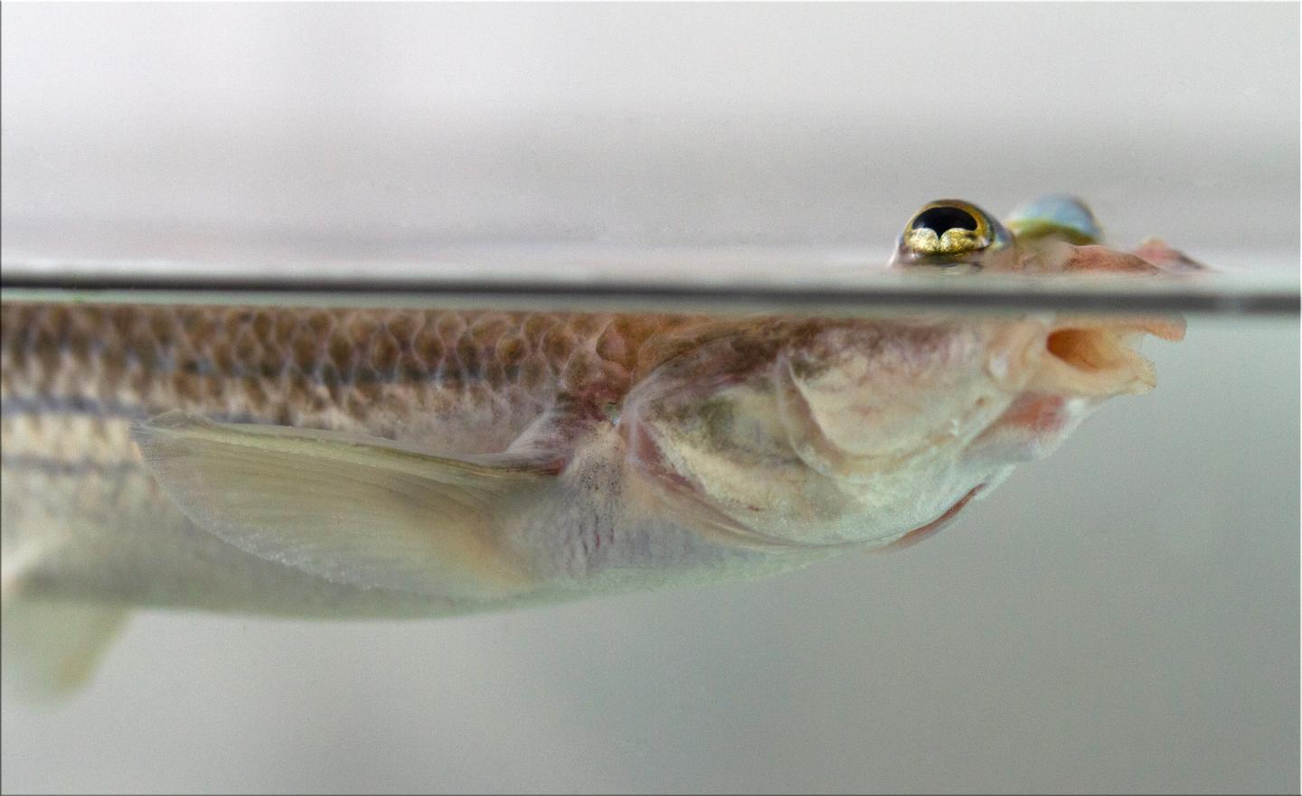 image: A specimen of Anableps, a genus of four-eyed fishes which, alongside their relatives, constitute the Anablepidae family of fishes. Among their peculiar characteristics are a "split" eye for aquatic and aerial vision, being live-bearers that give birth to fully developed offspring, and asymmetric genitalia among the males of all species and the females of some species.