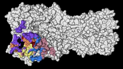image:Â Hemagglutinin (HA) is a protein on the surface of the influenza virus that attaches to receptors on host cells. A new study shows how antibodies that target conserved, stable portions of HA, shown in the colored portions here, were highly effective at fighting the virus.
