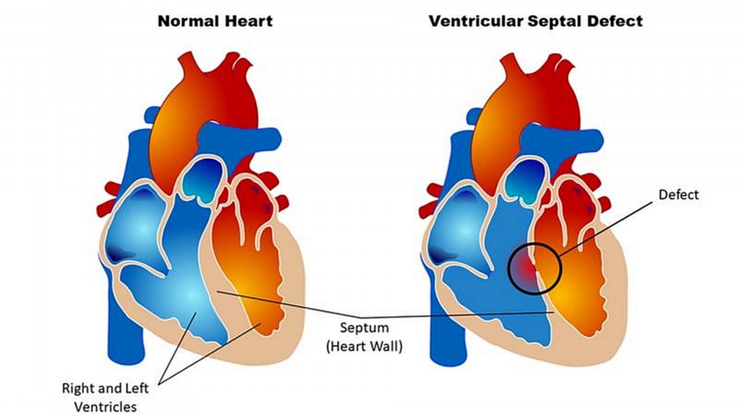 image: Graphic comparing a normal heart to one with a typical congenital heart defect where there is a hole in the wall separating the lower two chambers. A Johns Hopkins-led study recommends that children who have surgery to repair defects such as this be monitored to lower their risk of hypertension during adulthood.
