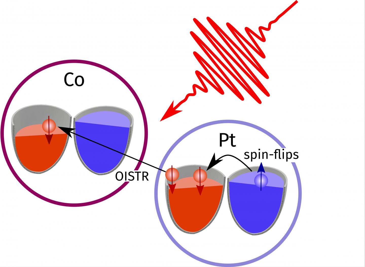 Due to the laser pulse, electrons within the solid are transferred from the Pt atoms to the Co atoms. It turns out that these are preferentially spin-down electrons because many empty states for spin-down electrons are available at the receiving Co site. At the Co atom, the transferred electrons, thus, increase the level of the spin-down electrons (red in Figure 2), making it more similar to the spin-up reservoir and hence reducing the magnetic moment of the Co atom. This OISTR process between Pt and Co is accompanied by a leveling of the electron reservoirs locally at the Pt atoms via spin flips. This spin-flip happens efficiently at the heavy Pt atoms exhibiting large spin-orbit-coupling and only to a much lesser extent at the lighter Co atoms.