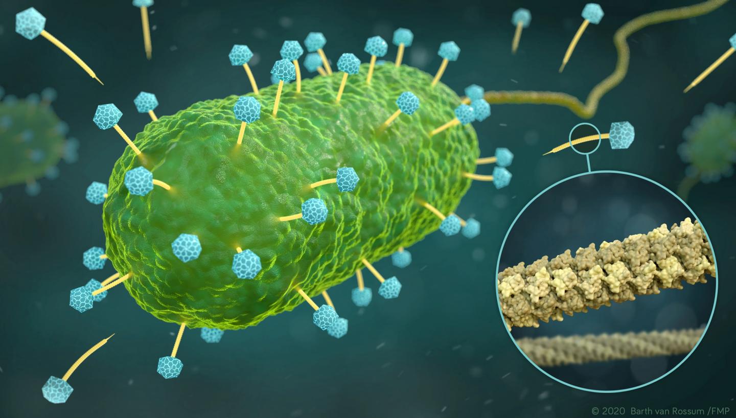 image: Artistic representation of phages of the family Siphoviridae (yellow and blue) that infect a bacterial cell (green). The excerpt (circle) shows the atomic structure of the DNA tube (yellow), through which the phages inject their DNA into the bacterium.